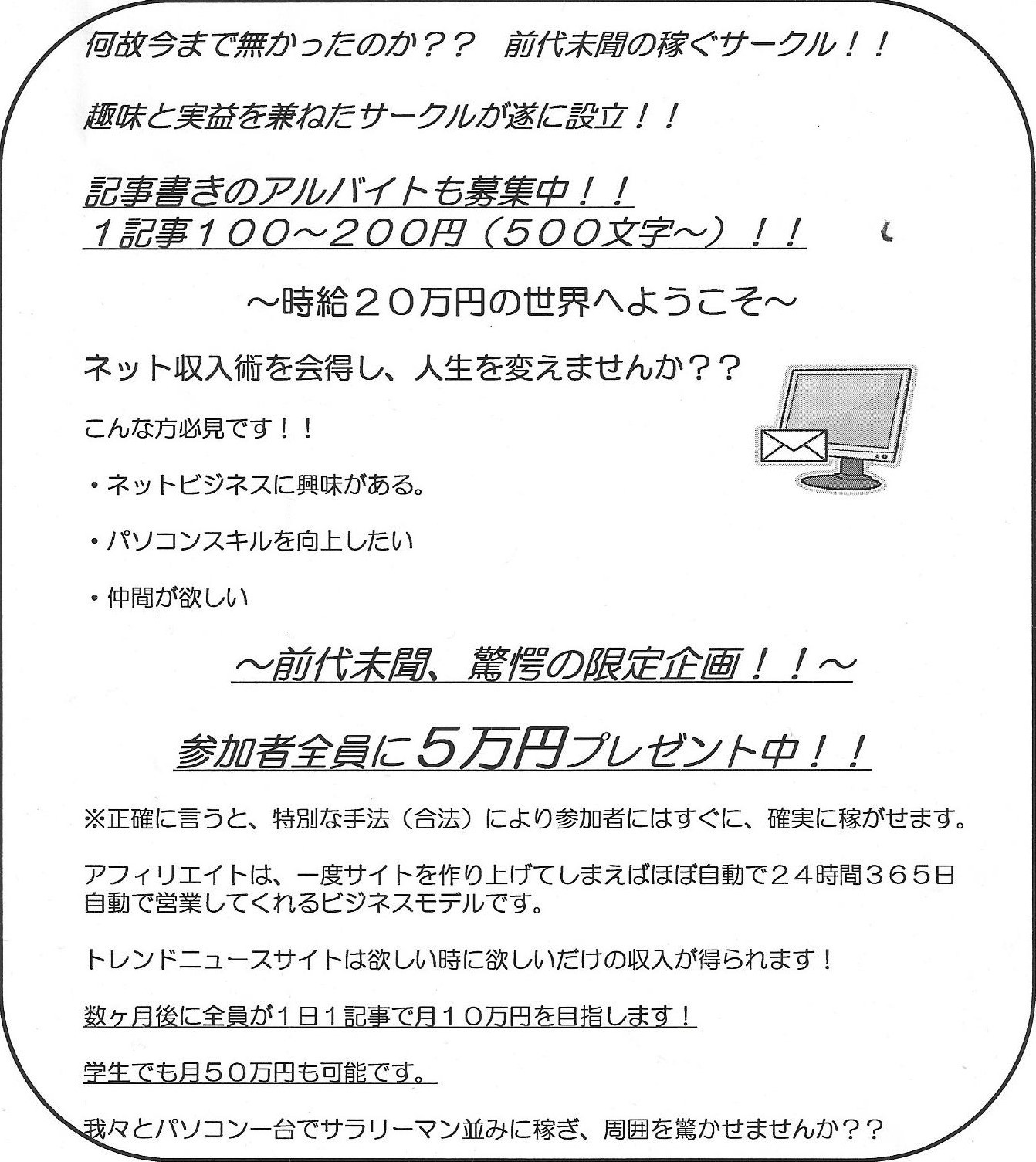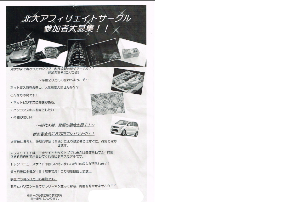 【ステルスマーケティング Vol.37】個人情報流出により、北大でコピペブログを運営するアフィサークルの存在が発覚【迷惑サービス防止情報 Vol.30】東日本大震災を用いた詐欺を行っていた可能性が高い鶴田浩之この北海道アフィリエイトサークルは以下の様なポスターを配ってコピペブログ(2chまとめサイト等)のアフィリエイト等に勤しんでいました。どうやら、この北海道大学アフィリエイトサークルというのが正式名称のようで、他に名称はないようです。