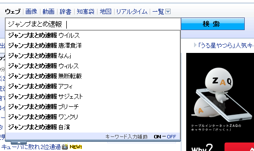2ちゃんねるの利用者とコピペブログの激突は昨今増々激化しておりますが、その中でサジェスト汚染という2ちゃんねるのなんでも実況版(通称なんJ)が発祥の手法が最近流行っている模様です。サジェスト汚染とは、平たく言うとウェブ検索のキーワード候補にウィルスや著作権侵害など、評判が悪いという印象がもたれるキーワードが関連候補に出るようにするための方法です。サジェストとは、あるキーワードを検索するとそれに関連した検索候補が自動的に出てくる機能の事です。