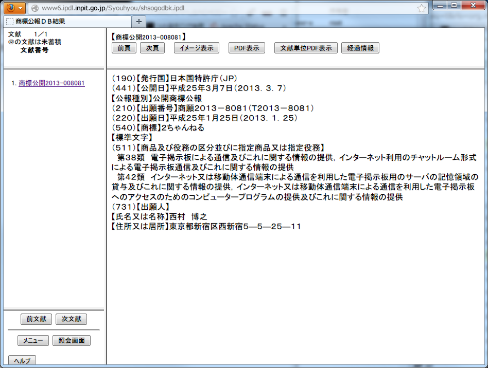 とりあえず、事が進展次第、別途記述いたします。この件に関する情報も掲示板やツイッターで募集しますので、お気軽に書いていってください。検索しやすいよう、商標公報の情報を貼っておきます。